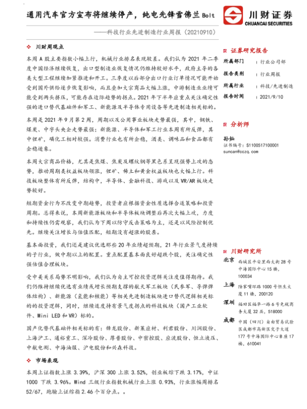 【川财证券】【20210910】科技行业先进制造行业周报:通用汽车官方宣布将继续停产,纯电先锋雪佛兰Bolt-11页 行业研究