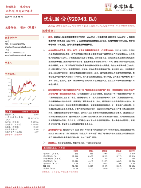 【华源证券】【202511】优机股份(920943.BJ)——2025Q3业绩略显承压,可转债项目旨在拓展深海工程及海外市场+布局特种材料领域-3页 证券期货研究报告