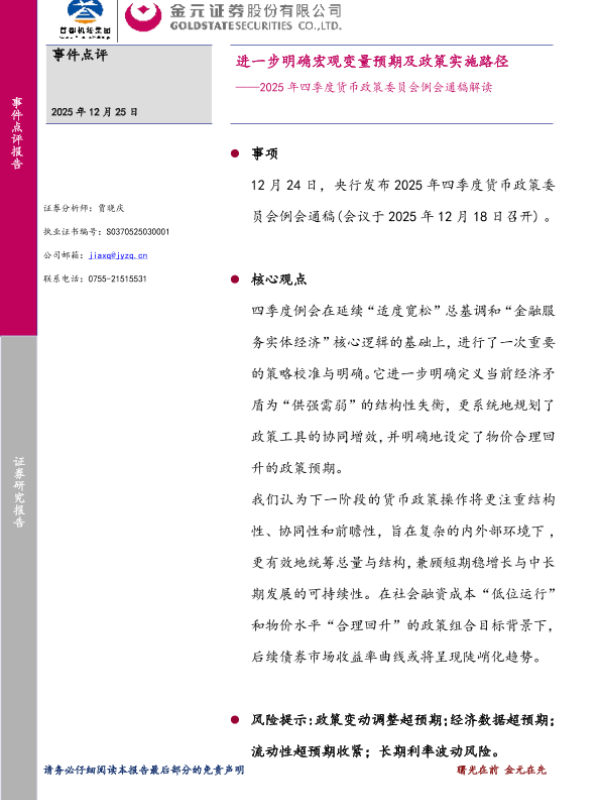 【金元证券】【202512】进一步明确宏观变量预期及政策实施路径——2025年四季度货币政策委员会例会通稿解读-6页 证券期货研究报告