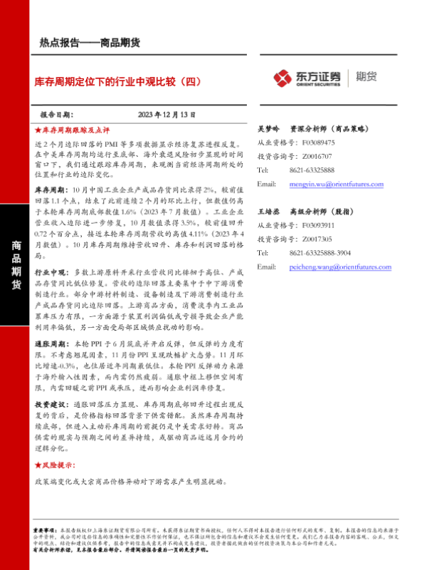 【东证期货】【20231213】商品期货热点报告:库存周期定位下的行业中观比较(四)-10页 行业研究