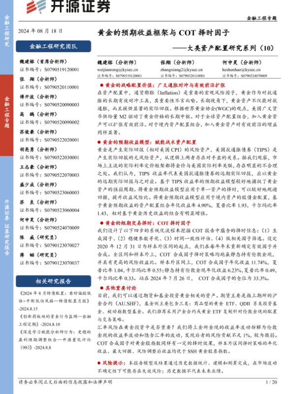 【开源证券】【20240818】大类资产配置研究系列(10):黄金的预期收益框架与COT择时因子-20页 行业研究