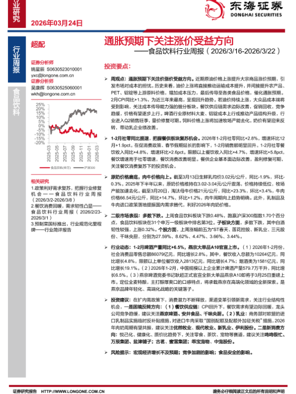 【东海证券】【202603】通胀预期下关注涨价受益方向——食品饮料行业周报(2026/3/16-2026/3/22)-11页 证券期货研究报告