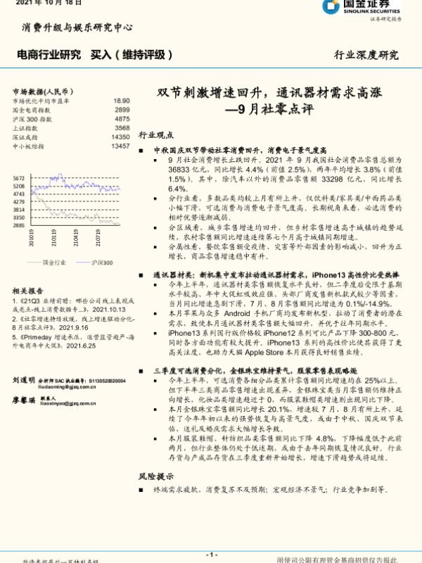 【国金证券】【20211018】电商行业9月社零点评:双节刺激增速回升,通讯器材需求高涨-18页 行业研究