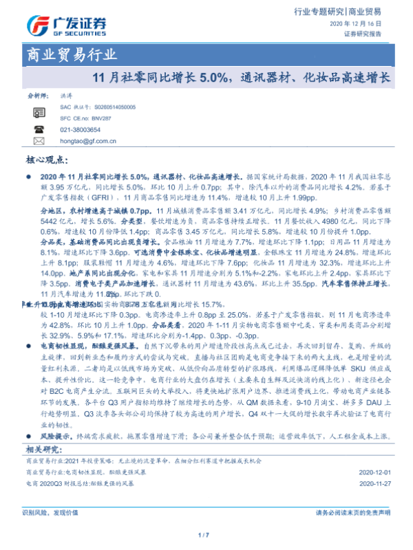 【广发证券】【20201216】11月社零同比增长5.0%,通讯器材、化妆品高速增长-7页 行业研究
