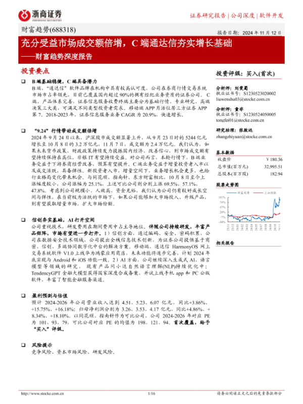 【浙商证券】【20241112】财富趋势(688318)深度报告:充分受益市场成交额倍增,C端通达信夯实增长基础-16页 行业研究