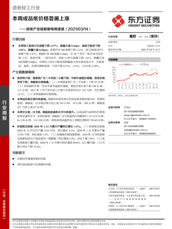 【东方证券】【20210314】20210314-东方证券-造纸产业链数据每周速递:本周成品纸价格普遍上涨-14页 行业研究