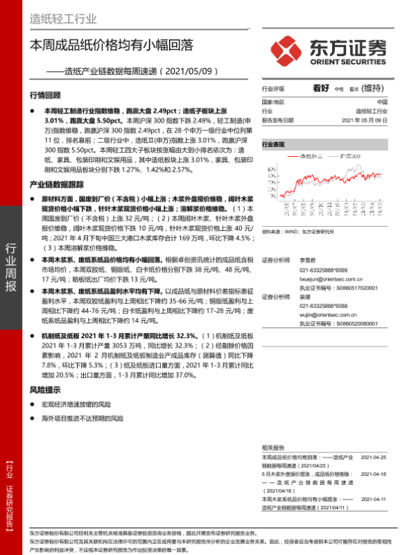 【东方证券】【20210509】20210509-东方证券-造纸产业链数据每周速递:本周成品纸价格均有小幅回落-13页 行业研究