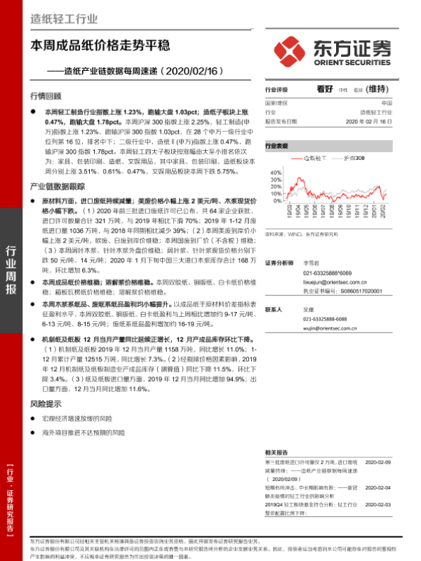 【东方证券】【20200216】造纸产业链数据每周速递:本周成品纸价格走势平稳-14页 证券期货研究报告
