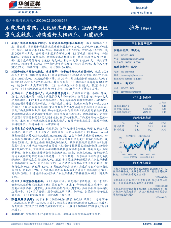 【华创证券】【20200628】20200628-华创证券-轻工制造行业周报:木浆库存震荡,文化纸库存触底,造纸产业链景气度触底,持续看好太阳纸业、山鹰纸业-15页 行业研究