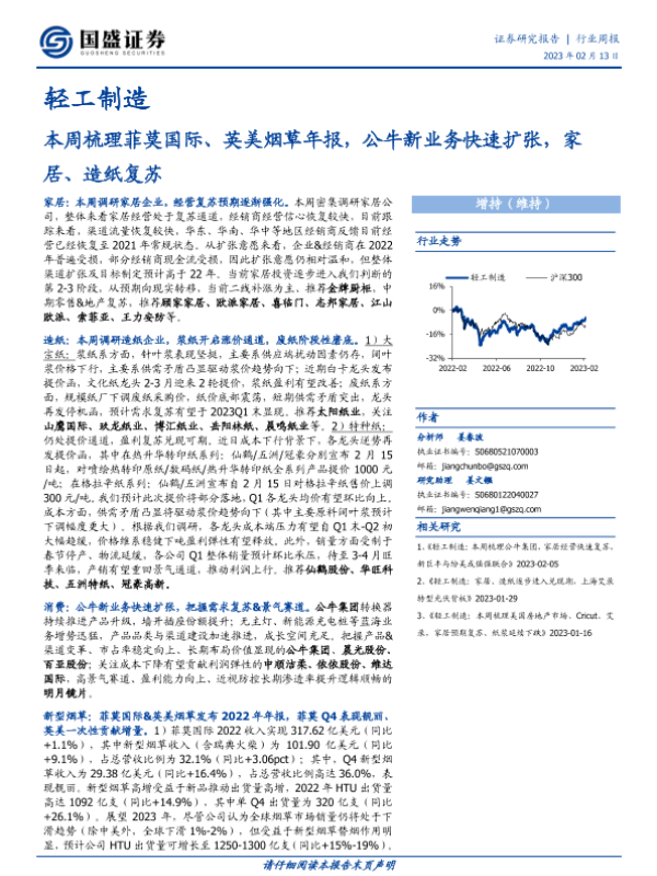 【国盛证券】【20230213】轻工制造行业周报:本周梳理菲莫国际、英美烟草年报,公牛新业务快速扩张,家居、造纸复苏-43页 行业研究