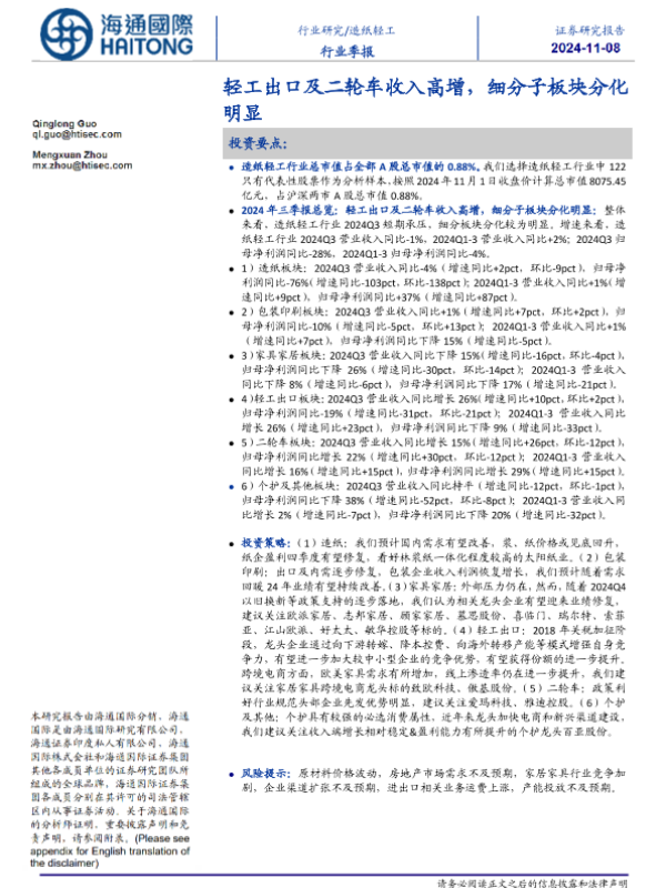 【海通国际】【20241108】造纸轻工行业季报:轻工出口及二轮车收入高增,细分子板块分化明显-16页 行业研究