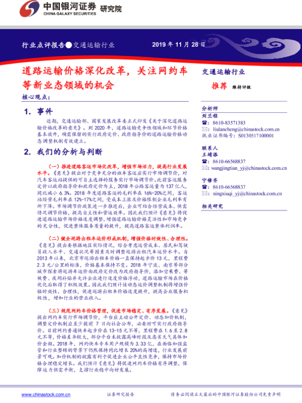 【银河证券】【20191128】交通运输行业点评报告:道路运输价格深化改革,关注网约车等新业态领域的机会-4页 行业研究