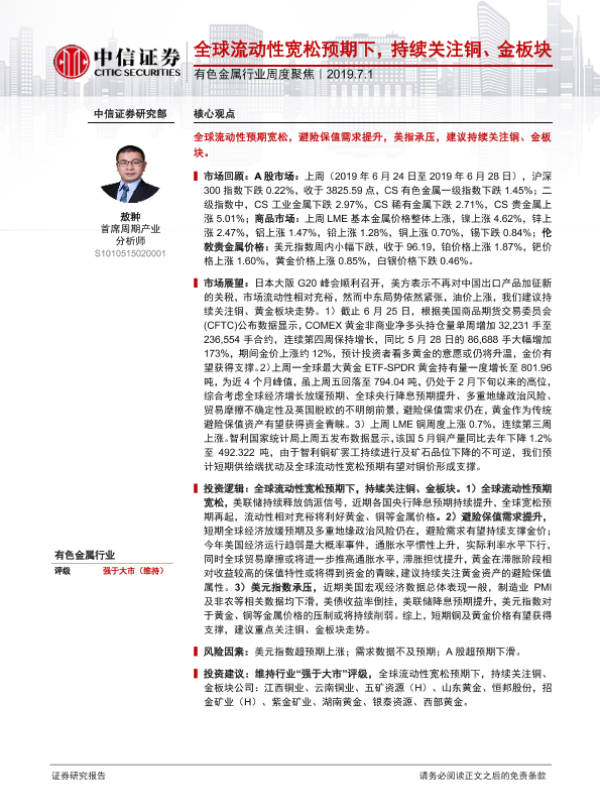 【中信证券】【20190701】20190701-中信证券-有色金属行业周度聚焦:全球流动性宽松预期下,持续关注铜、金板块-19页 行业研究