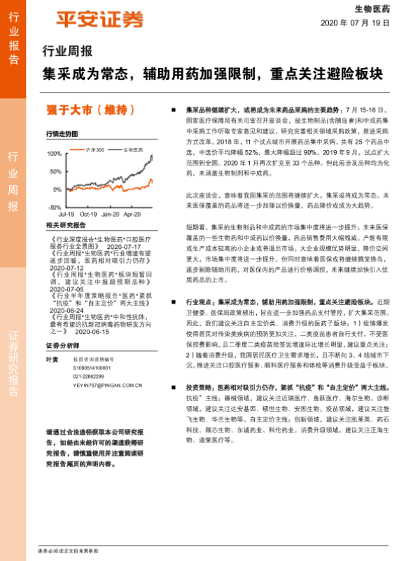 【平安证券】【20200719】生物医药行业周报:集采成为常态,辅助用药加强限制,重点关注避险板块-7页 行业研究