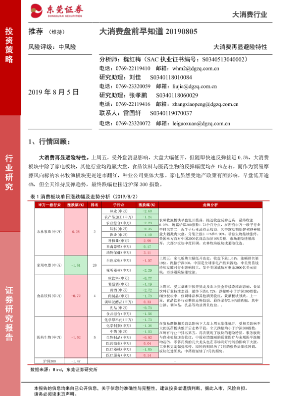 【东莞证券】【20190805】大消费盘前早知道:大消费再显避险特性-6页 行业研究