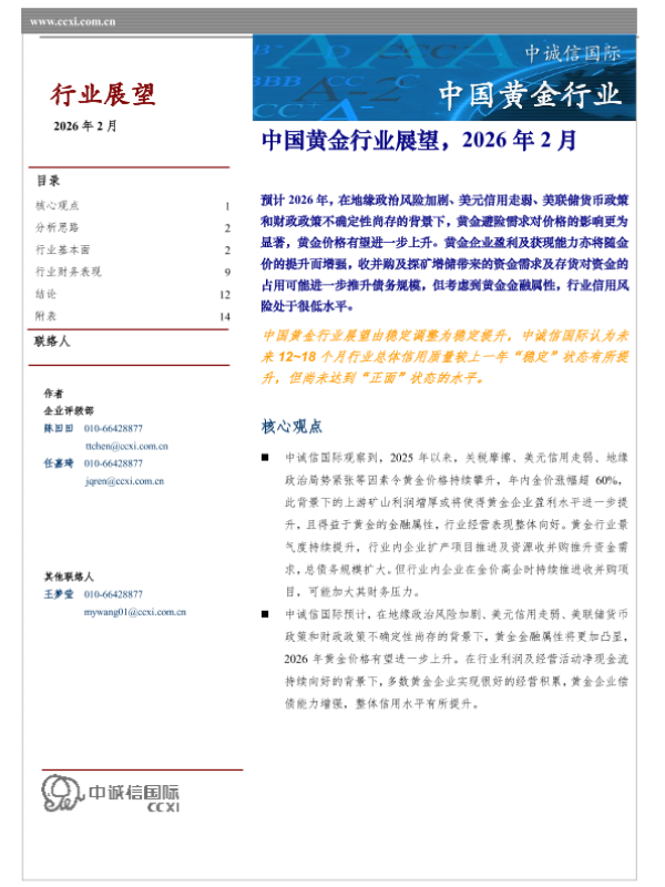 【中诚信国际】【202602】中国黄金行业展望,2026年 2月-16页 行业研究