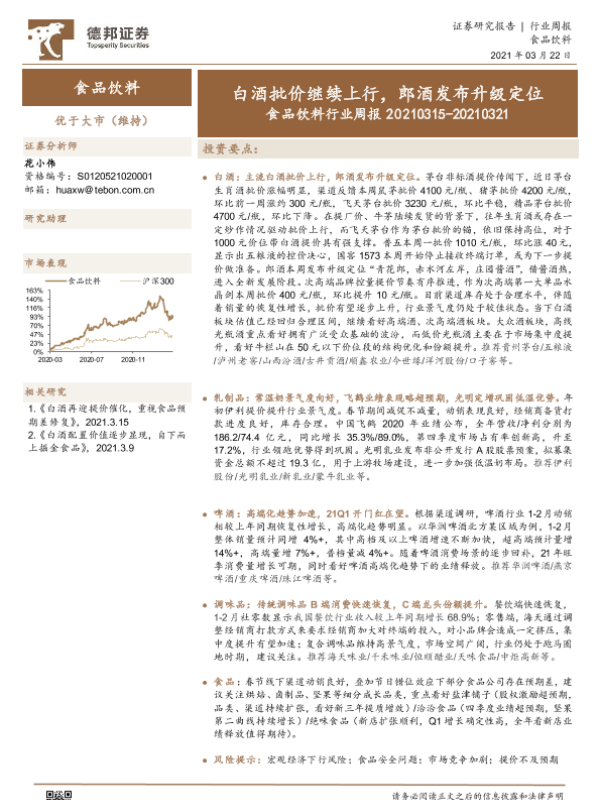 【德邦证券】【20210322】食品饮料行业周报:白酒批价继续上行,郎酒发布升级定位-16页 证券期货研究报告