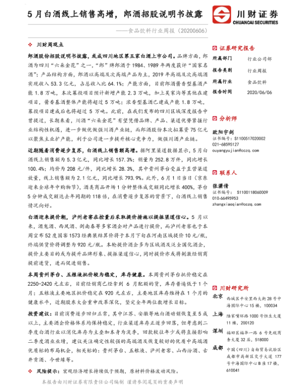 【川财证券】【20200606】食品饮料行业周报:5月白酒线上销售高增,郎酒招股说明书披露-13页 证券期货研究报告