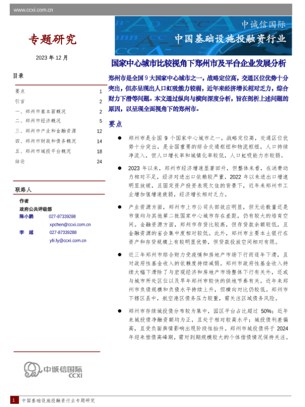 【中诚信国际】【202312】国家中心城市比较视角下郑州市及平台企业发展分析-25页 行业研究