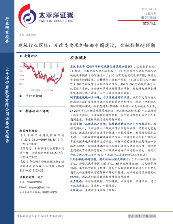 【太平洋证券】【20190414】建筑行业周报:发改委要求加快都市圈建设,金融数据超预期-13页 行业研究