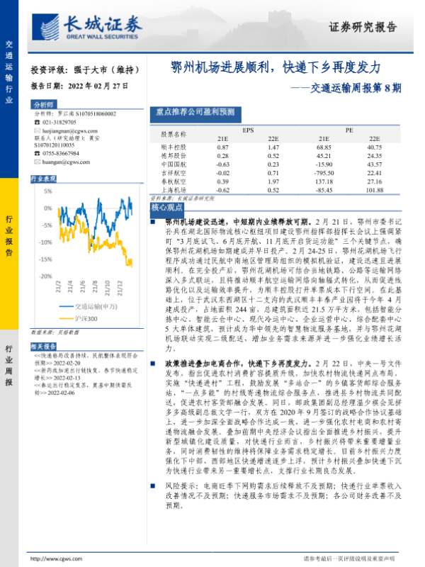 【长城证券】【20220227】交通运输周报第8期:鄂州机场进展顺利,快递下乡再度发力-29页 行业研究