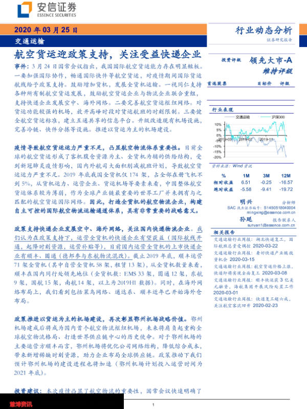 【安信证券】【20200325】交通运输行业动态分析:航空货运迎政策支持,关注受益快递企业-4页 行业研究