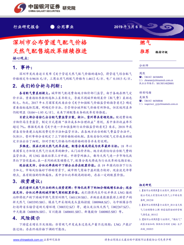 【银河证券】【20190106】深圳市公布管道气配气价格 天然气配售端改革继续推进-3页 行业研究