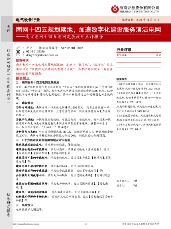 【浙商证券】【20211114】南方电网十四五电网发展规划点评报告:南网十四五规划落地,加速数字化建设服务清洁电网-4页 行业研究