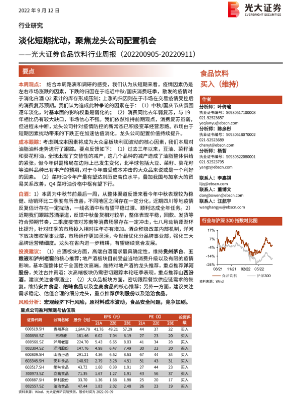 【光大证券】【20220912】食品饮料行业周报:淡化短期扰动,聚焦龙头公司配置机会-10页 行业研究