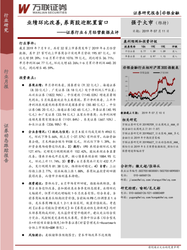 【万联证券】【20190711】证券行业6月经营数据点评:业绩环比改善,券商股迎配置窗口-8页 行业研究