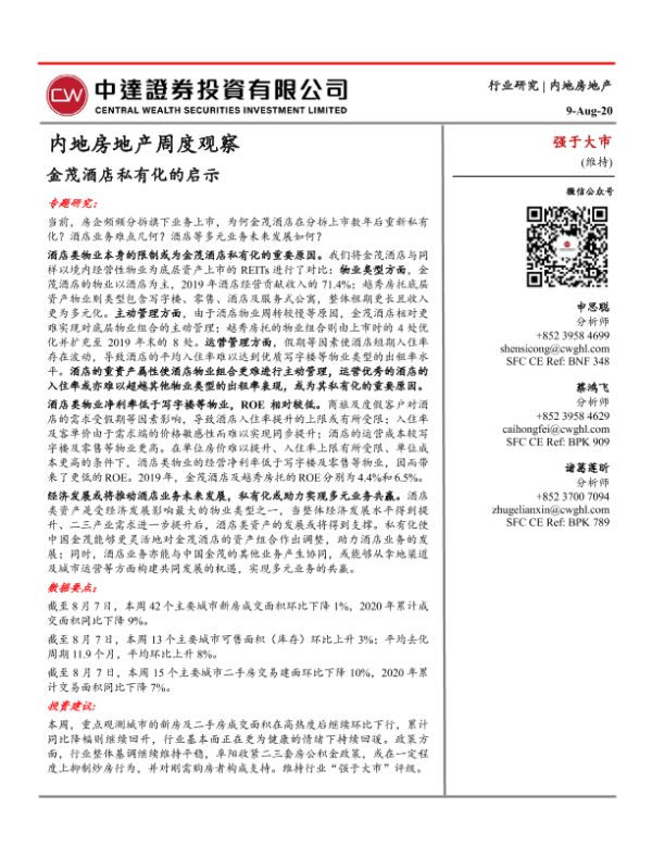 【中达证券】【20200809】内地房地产周度观察:金茂酒店私有化的启示-23页 行业研究