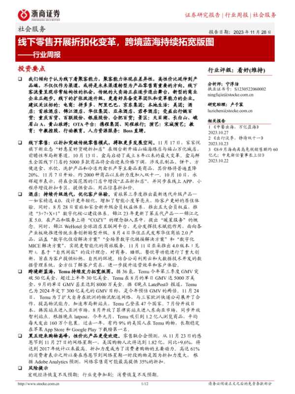 【浙商证券】【20231128】社会服务行业周报:线下零售开展折扣化变革,跨境蓝海持续拓宽版图-12页 行业研究