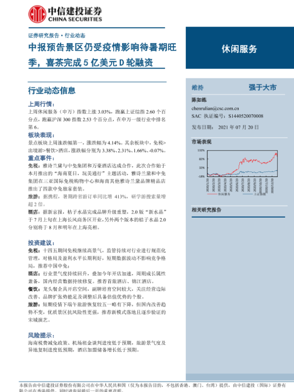 【中信建投证券】【20210720】休闲服务行业:中报预告景区仍受疫情影响待暑期旺季,喜茶完成5亿美元D轮融资-15页 行业研究