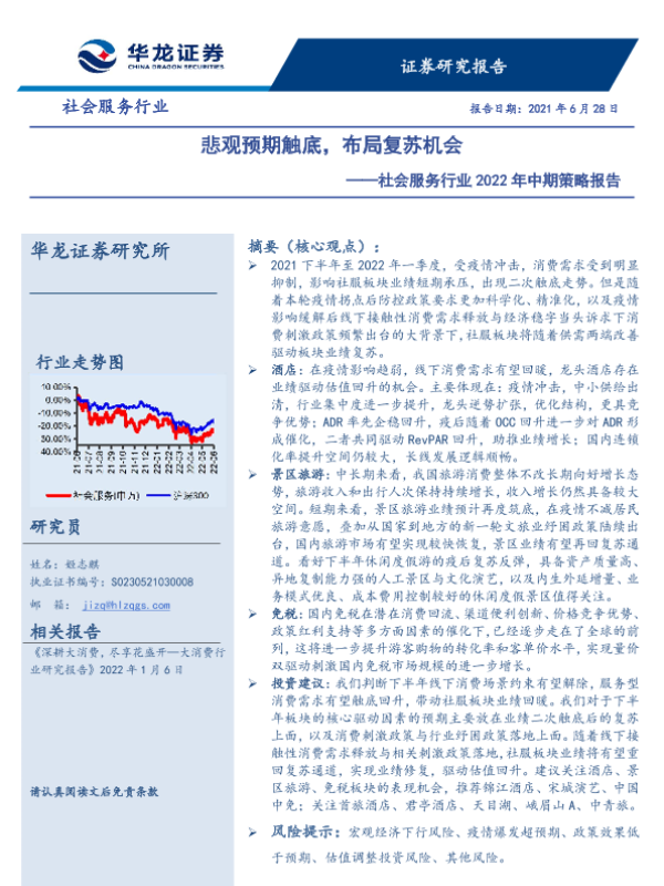 【华龙证券】【20220628】社会服务行业2022年中期策略报告:悲观预期触底,布局复苏机会-28页 行业研究