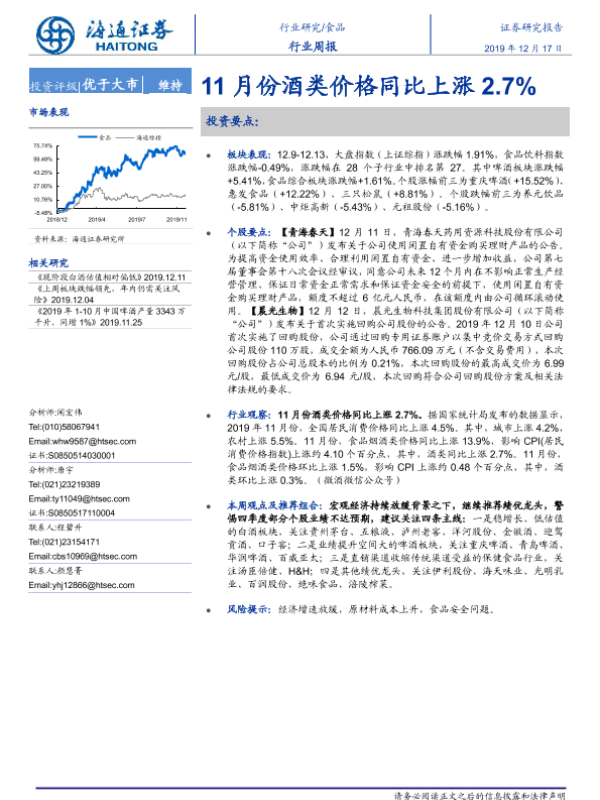 【海通证券】【20191217】20191217-海通证券-食品行业周报:11月份酒类价格同比上涨2.7%-10页 行业研究