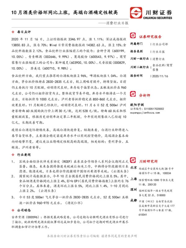 【川财证券】【20201116】10月酒类价格环同比上涨,高端白酒确定性较高-3页 行业研究
