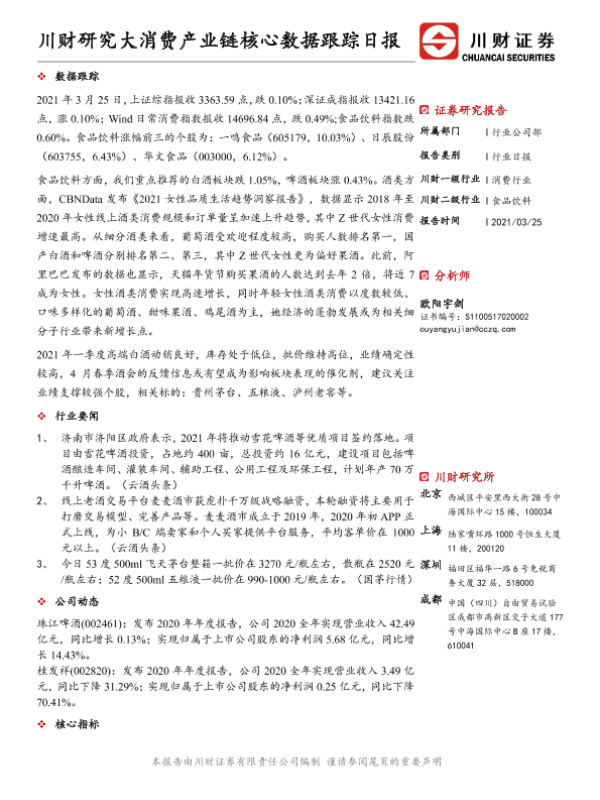 【川财证券】【20210325】20210325-川财证券-大消费产业链核心数据跟踪日报-4页 行业研究