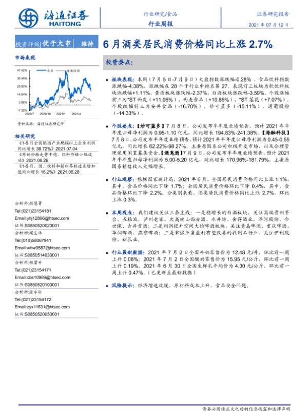 【海通证券】【20210712】20210712-海通证券-食品行业周报:6月酒类居民消费价格同比上涨2.7%-7页 行业研究