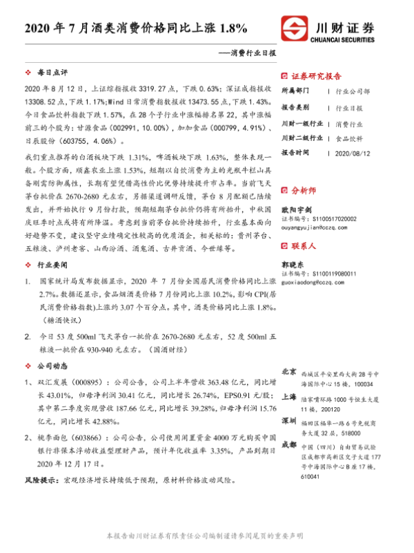 【川财证券】【20200812】2020年7月酒类消费价格同比上涨1.8%-3页 证券期货研究报告
