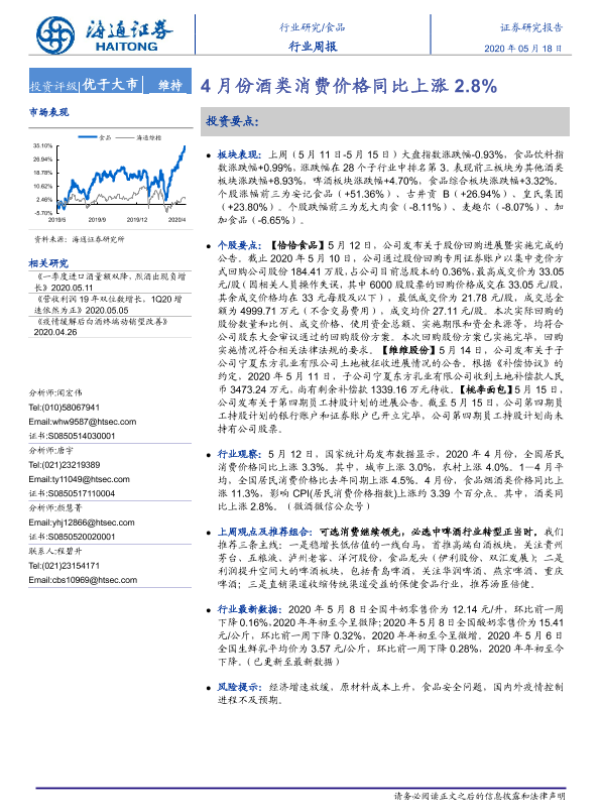 【海通证券】【20200518】20200518-海通证券-食品行业周报:4月份酒类消费价格同比上涨2.8%-7页 行业研究