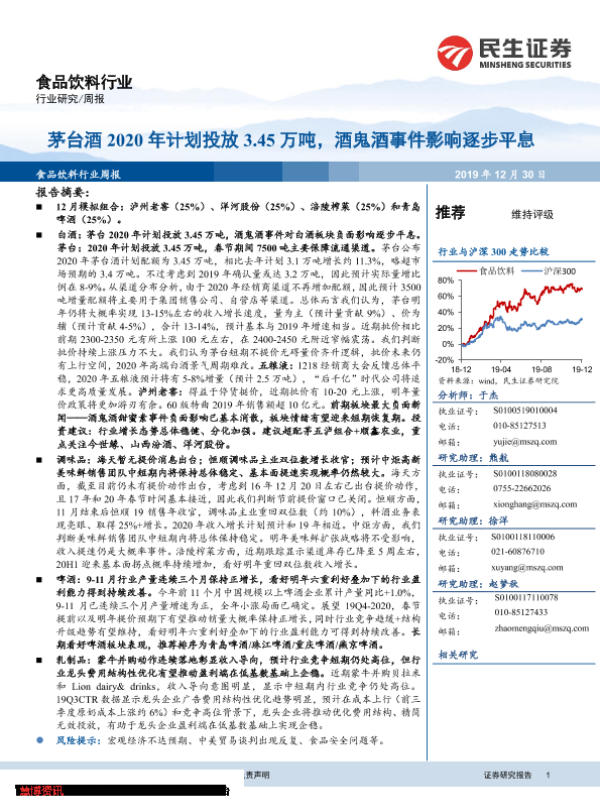 【民生证券】【20191230】20191230-民生证券-食品饮料行业周报:茅台酒2020年计划投放3.45万吨,酒鬼酒事件影响逐步平息-26页 行业研究