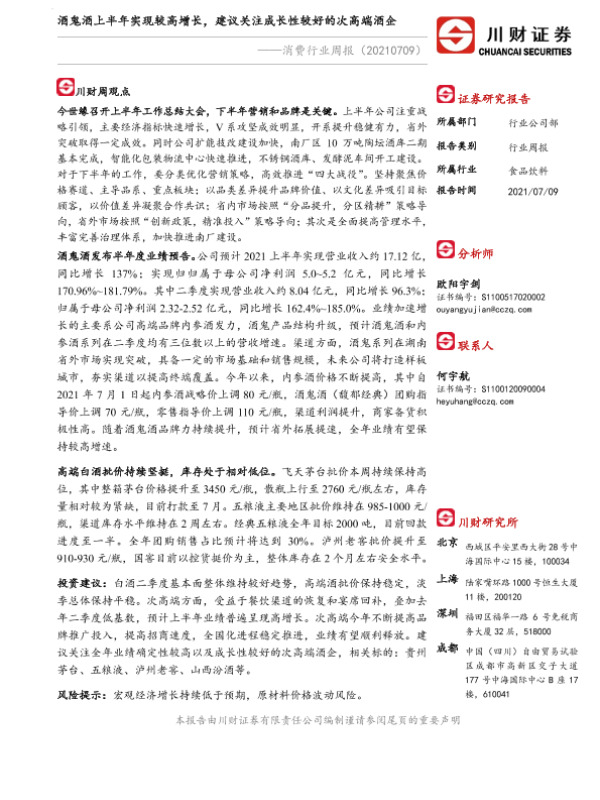【川财证券】【20210709】20210709-川财证券-消费行业周报:酒鬼酒上半年实现较高增长,建议关注成长性较好的次高端酒企-12页 行业研究