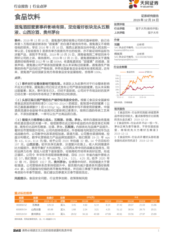 【天风证券】【20191224】食品饮料:酒鬼酒甜蜜素事件影响有限,坚定看好板块龙头五粮液、山西汾酒、贵州茅台-3页 行业研究