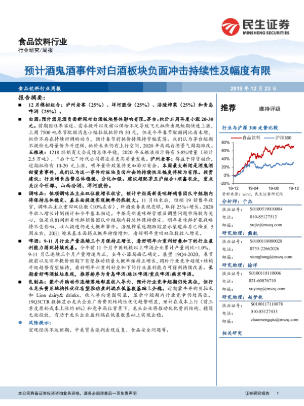 【民生证券】【20191223】20191223-民生证券-食品饮料行业周报:预计酒鬼酒事件对白酒板块负面冲击持续性及幅度有限-25页 行业研究