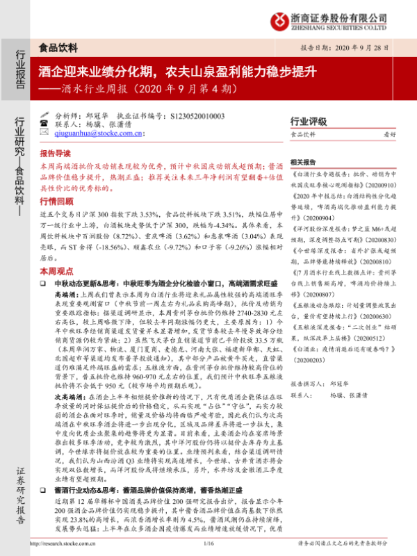 【浙商证券】【20200928】酒企迎来业绩分化期,农夫山泉盈利能力稳步提升-16页 行业研究