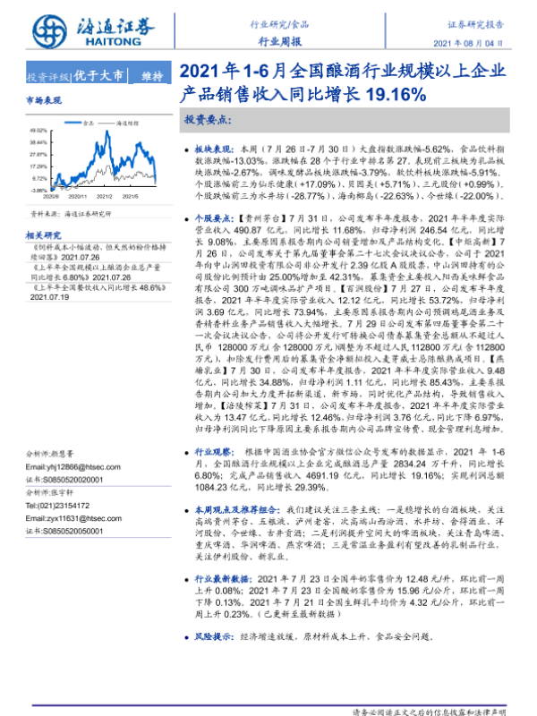 【海通证券】【20210804】20210804-海通证券-食品行业周报:2021年1-6月全国酿酒行业规模以上企业产品销售收入同比增长19.16%-7页 行业研究