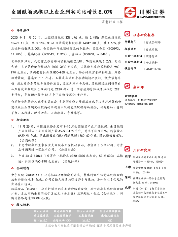 【川财证券】【20201126】全国酿酒规模以上企业利润同比增长8.07%-3页 行业研究