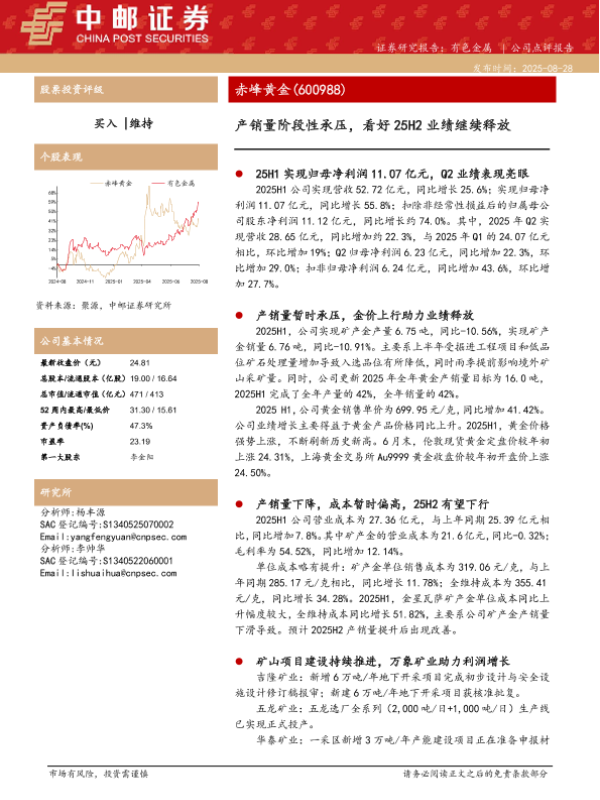 【中邮证券】【20250828】赤峰黄金-产销量阶段性承压,看好25H2业绩继续释放-5页 证券期货研究报告