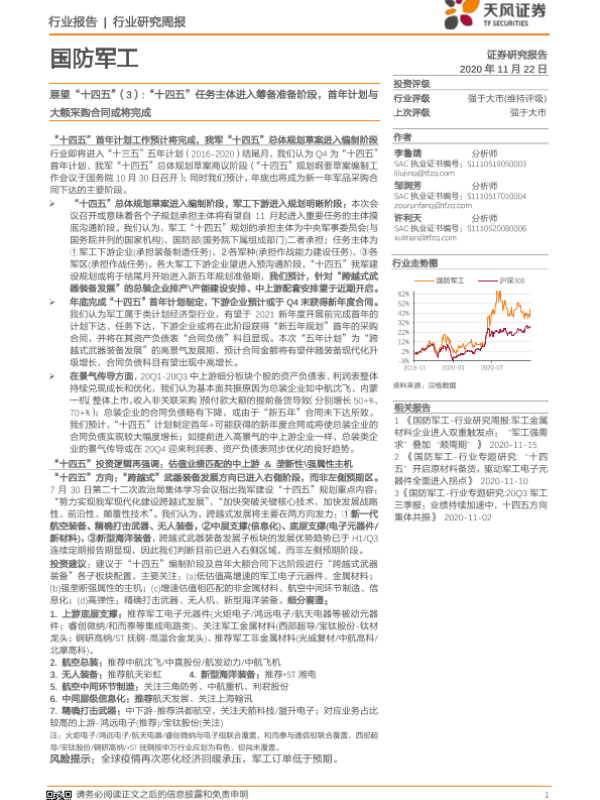 【天风证券】【20201122】国防军工行业:展望“十四五”(3) “十四五”任务主体进入筹备准备阶段,首年计划与大额采购合同或将完成-2页 行业研究