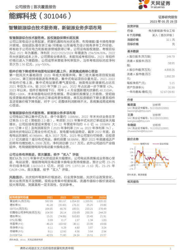 【天风证券】【20230528】能辉科技-301046.SZ-智慧能源综合技术服务商,新能源业务多项布局-26页 行业研究